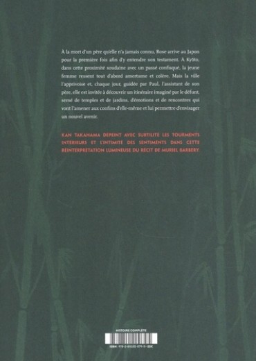 A la mort d'un père qu'elle n'a jamais connu, Rose arrive au japon pour la première fois afin d'y entendre son testament. A Kyoto, dans cette proximité soudaine avec un passé confisqué, la jeune femme ressent tout d'abord amertume et colère. Mais la ville l'apprivoise et, chaque jour, guidée par Paul, l'assistant de son père, elle est invitée à découvrir un itinéraire imaginé par le défunt, semé de temples et de jardins, d'émotions et de rencontres qui vont l'amener aux confins d'elle-même et lui permettre d'envisager un nouvel avenir. Kan Takahama dépeint avec subtilité les tourments intérieurs et l'intimité des sentiments dans cette réinterprétation lumineuse du récit de Muriel Barbery.