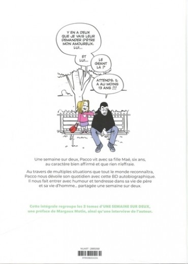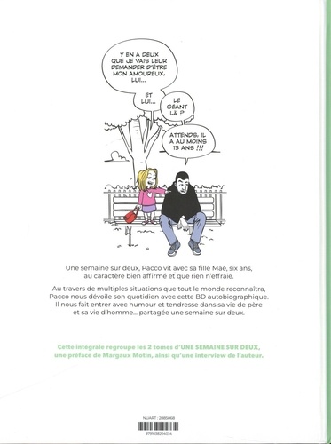Une semaine sur deux, Pacco vit avec sa fille Maé, six ans, au caractère bien affirmé et que rien n'effraie. Au travers de multiples situations que tout le monde reconnaîtra, Pacco nous dévoile son quotidien avec cette BD autobiographique. Il nous fait entrer avec humour et tendresse dans sa vie de père et sa vie d'homme... partagée une semaine sur deux. Cette intégrale regroupe les 2 tomes d'Une semaine sur deux, une préface de Margaux Motin, ainsi qu'une interview de l'auteur.