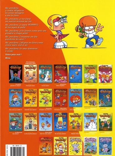 Elections chez Les P'tits Diables ! L'heure des élections approche. C'est un moment clé pour notre société. Un tournant décisif pour chacun d'entre nous. Un nouveau monde verra le jour à l'issue de ce vote historique. Ces élections apporteront de l'angoisse à certains, de l'espoir à d'autres. Cette campagne aux enjeux cruciaux s'annonce tendue. La lutte sera âpre. Et tous les coups seront permis... même les plus drôles ! Qui, de Tom ou Nina accédera au pouvoir ? Qui, des frères ou des soeurs asserviront les autres ? Le suspense est insoutenable... Et pourtant, vous devrez attendre la sortie du tome 23 pour connaître le résultat !