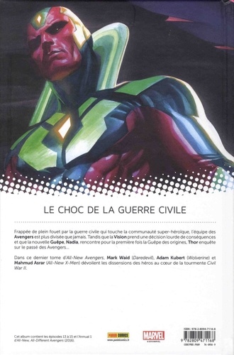 Frappée de plein fouet par la guerre civile qui touche la communauté super-héroïque, l'équipe des Avengers est plus divisée que jamais. Tandis que la Vision prend une décision lourde de conséquences et que la nouvelle Guêpe, Nadia, rencontre pour la première fois la Guêpe des origines, Thor enquête sur le passé des Avengers... Dans ce dernier tome d'All-New Avengers, Mark Waid (Daredevil), Adam Kubert (Wolverine) et Mahmud Asrar (All-New X-Men) dévoilent les dissensions des héros au coeur de la tourmente Civil War Il.