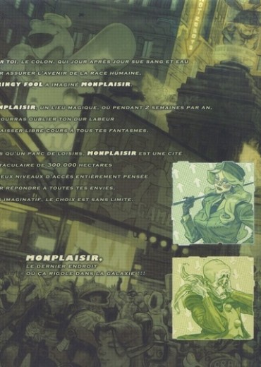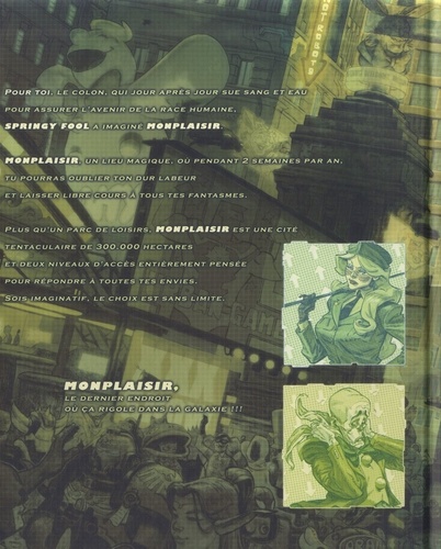 Pour toi, le colon, qui jour après jour sue sang et eau pour assurer l'avenir de la race humaine, Springy Fool a imaginé Monplaisir. Monplaisir, un lieu magique, où pendant 2 semaines par an, tu pourras oublier ton dur labeur et laisser libre cours à tous tes fantasmes. Plus qu'un parc de loisirs, Monplaisir est une cité tentaculaire de 300.000 hectares et deux niveaux d'accès entièrement pensée pour répondre à toutes tes envies. Sois imaginatif, le choix est sans limite. Monplaisir, le dernier endroit où ça rigole dans la galaxie !