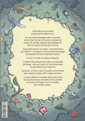 Vadrouille est une petite boule de poils pleine de vie. Ce chat adore se balader dans le quartier, dormir tout en haut d'un arbre, chasser les oiseaux et se faire caresser par les passants. Surtout quand Tammy est à l'école. Quand elle rentre à la maison, Vadrouille est là qui l'attend. Il lui rapporte, enfouis dans son pelage, les souvenirs de ses escapades diurnes. Un jour, il lui fait un cadeau intriguant. La petite fille se lance alors dans une enquête périlleuse : elle veut savoir où Vadrouille passe ses journées en son absence. Jonathan, un ami un peu froussard, est entraîné bien malgré lui dans cette mission secrète. Les deux petits camarades découvrent alors les recoins les plus sombres de leur quartier et l'univers effrayant du Dr Corneille, leur terrible voisine...