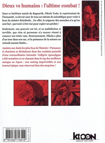 Dieux vs humains : l'ultime combat ! Dans ce huitième match du Ragnarök, Nikola Tesla, le représentant de l'humanité, va devoir user de tous ses talents de scientifique pour venir à bout du sinistre Belzébuth... En effet, le seigneur des mouches n'a qu'un seul but : parvenir à être tué pour expier ses péchés ! Seulement, son pouvoir est tel, et sa malédiction si terrible, que rien ni personne n'a encore réussi à exaucer son triste voeu. Heureusement, Nikola a plus d'un tour dans son sac, et la puissance de la science ne connaît aucune limite... Assistez aux duels les plus fous de l'histoire ! Puissance et charisme se déchaînent dans des combats jouissifs d'une extraordinaire intensité. Valkyrie Apocalypse a fait sensation en se classant dans le top des meilleurs mangas au Japon : son casting imprévisible et son tournoi épique vous réservent bien des surprises !