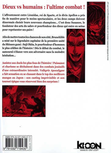 Dieux vs humains : l'ultime combat ! L'affrontement entre Léonidas, roi de Sparte, et le divin Apollon a pris fin de manière pour le moins spectaculaire, et les deux camps doivent désormais choisir leurs nouveaux champions... C'est donc Susanoo, le fondateur des arts du sabre et pourfendeur des dieux qui entre en scène pour représenter ses pairs ! Afin de mettre toutes les chances de son côté, Brunehilde a misé sur le légendaire capitaine de la première unité du Shinsen gumi : Soji Okita, le pourfendeur d'hommes le plus célèbre de l'histoire ! Dès le début du combat, le samouraï s'élance vers son adversaire sans la moindre hésitation... Assistez aux duels les plus fous de l'histoire ! Puissance et charisme se déchaînent dans des combats jouissifs d'une extraordinaire intensité. Valkyrie Apocalypse a fait sensation en se classant dans le top des meilleurs mangas au Japon : son casting imprévisible et son tournoi épique vous réservent bien des surprises !