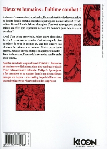 Au terme d'un combat extraordinaire, l'humanité est forcée de reconnaître sa défaite dans le match d'ouverture qui l'oppose à ses créateurs ! Ivre de colère, Brunehilde choisit un champion d'un tout autre genre : qui de mieux, en effet, que le premier de tous les hommes pour défendre ces derniers ? Armé d'un poing américain, Adam entre alors dans l'arène ! Hélas, son adversaire n'est autre que le père suprême de tout le cosmos et, une fois encore, les chances de vaincre sont minces. Mais contre toute attente, Zeus est envoyé au tapis en quelques minutes ! Pour les humains, l'heure de la revanche semble enfin avoir sonné... Assistez aux duels les plus fous de l'histoire ! Puissance et charisme se déchaînent dans des combats jouissifs d'une extraordinaire intensité. Valkyrie Apocalypse a fait sensation en se classant dans le top des meilleurs mangas au Japon : son casting imprévisible et son tournoi épique vous réservent bien des surprises !