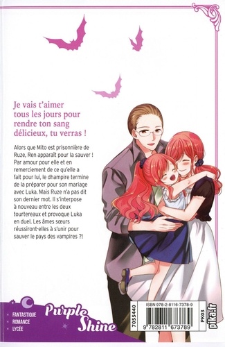 Alors que Mito est prisonnière de Ruze, Ren apparaît pour la sauver ! Par amour pour elle et en remerciement de ce qu'elle a fait pour lui, le dhampire termine de la préparer pour son mariage avec Luka. Mais Ruze n'a pas dit son dernier mot. Il s'interpose à nouveau entre les deux tourtereaux et provoque Luka en duel. Les âmes soeurs réussiront-elles à s'unir pour sauver le pays des vampires ? !
