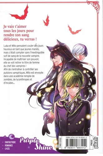 Je vais t'aimer tous les jours pour rendre ton sang délicieux, tu verras ! Luka et Mito pensaient couler des jours heureux en tant que jeunes mariés, mais c'était compter sans l'inextinguible soif de sang de la nouvelle vampire. Incapable de maîtriser son pouvoir, elle se voit retirer le titre de femme du chef des vampires ! Afin de s'entraîner à contrôler ses pulsions vampiriques, Mito est envoyée dans une académie remplie de zombies, de lycanthropes et d'incubes...