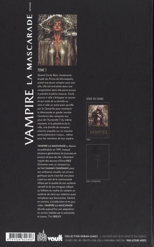 Quand Cecily Bain, lieutenante brujah du Prince de Minneapolis, prend une jeune vampire sous son aile, elle est entraînée dans une conspiration dont elle peine encore à prendre la pleine mesure. Cecily pourra-t-elle s'échapper et sauver ce qui reste de sa famille ou sera-t-elle un autre pion sacrifié par la Camarilla pour maintenir la Mascarade et garder secrète l'existence des vampires aux yeux de l'humanité ? Au même moment, à la périphérie de la ville, une famille de vampires anarchs enquête sur un meurtre particulièrement vicieux... même pour les membres de leur espèce. Vampire La Mascarade a, depuis sa publication en 1991, marqué plusieurs générations de joueuses et joueurs de jeux de rôle. Librement inspiré des oeuvres d'Anne Rice (Entretien avec un vampire) ou de Neil Gaiman (Sandman) pour son ambiance visuelle, cet univers gothique-punk s'est fait une place à part au sein de la communauté rôliste par la qualité de son système narratif et de ses intrigues mêlant au folklore du mythe du vampire un système de clans aux relations aussi complexes que fascinantes. Décliné en romans, à la télévision et en jeux vidéo, Vampire La Mascarade dévoile aujourd'hui son adaptation en comics réalisée par le scénariste, et joueur, Tim Seeley.