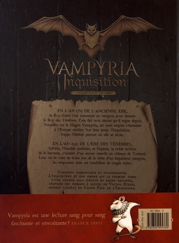 EN L'AN 1715 DE L'ANCIENNE ERE, le Roy-Soleil s'est transmuté en vampyre pour devenir le Roy des Ténèbres. Cela fait trois siècles qu'il règne depuis Versailles sur la Magna Vampyria, un vaste empire s'étendant à l'Europe entière. Son bras armé, l'Inquisition, frappe l'hérésie partout où elle se niche. EN L'AN 299 DE L'ERE DES TENEBRES, Sylvère l'humble jardinier et Daphné la noble lectrice de la baronne s'aiment d'un amour interdit au château de Torteval. Leur vie va voler en éclats lors de la visite d'un inquisiteur-vampyre, les emportant dans un tourbillon de magie noire. Uchronie romantique et frissonnante, " L'inquisiteur et son ombre " est le premier tome de VAMPYRIA INQUISITION : une grande saga inédite en bande dessinée, scénarisée par Victor Dixen, double lauréat du Grand Prix de l'Imaginaire.