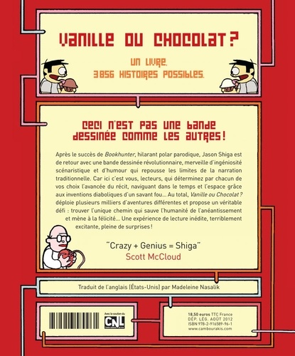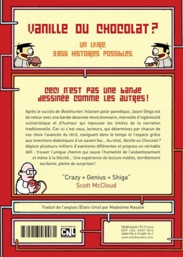 L'invention du génial Jason Shiga donne au livre-dont-vous-êtes-le-héros une ampleur inédite : ces quelques quatre-vingt pages de bande dessinée contiennent 3856 histoires possibles, que le lecteur explore en circulant entre les cases et les pages grâce à un réseau de tubes et d'onglets de couleurs ! Incroyablement ludique, ce livre qui joue de multiples paradoxes temporels, scientifiques et logiques se révèle d'une étonnante profondeur. Des choix les plus triviaux - vanille ou chocolat ? - découlent des conséquences à la portée insoupçonnable, la fin du monde ou sa rédemption... Un livre totalement original, qui a fait événement aux Etats-Unis.