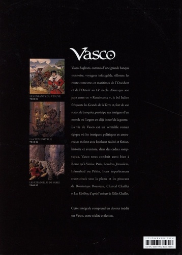 Vasco Baglioni, commis d'une grande banque siennoise, voyageur infatigable, sillonne les routes terrestres et maritimes de l'Occident et de l'Orient au 14 siècle. Alors que son pays entre en "Renaissance", le bel Italien fréquente les Grands de la Terre et, fort de son statut de banquier, participe aux intrigues d'un monde où l'argent est déjà le nerf de la guerre. La vie de Vasco est un véritable roman épique où les intrigues politiques et amoureuses mêlent avec bonheur réalité et fiction, histoire et aventure, dans des cadres somptueux. Vasco nous conduit aussi bien à Rome qu'à Venise, Paris, Londres, Jérusalem, Islamabad ou Pékin, lieux superbement reconstitués sous la plume et les pinceaux de Dominique Rousseau, Chantal Chaillet et Luc Révillon, d'après l'univers de Gilles Chaillet. Cette intégrale comprend un dossier inédit sur Vasco, entre réalité et fiction. Ce volume reprend les albums suivants : "Les Enfants du Vésuve", "La Cité ensevelie" et "Les Citadelles de sable", réalisés par Dominique Rousseau (dessin et scénario du tome 26) et Chaillet, et Luc Révillon (scénario des tomes 25 et 27).