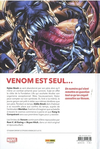 Dylan Brock apprend toujours à vivre avec le symbiote Venom sans l'aide de son père Eddie. Il va avoir l'occasion de mettre ses pouvoirs à l'épreuve quand une organisation lance à ses trousses un agent entraîné spécialement pour détruire les symbiotes ! Cèdera-t-il aux ténèbres ? Eddie Brock est-il vraiment mort ? On se demandait comment de nouveaux auteurs pourraient succéder à la précédente série Venom et à sa fracassante conclusion King in Black. La tâche n'était pas aisée et pourtant Ram V et Al Ewing (Immortal Hulk) réussissent brillamment avec une série qui enchaîne les coups de théâtre et intègre Kang, le nouveau grand vilain du Cinematic Universe, aux aventures de Venom !