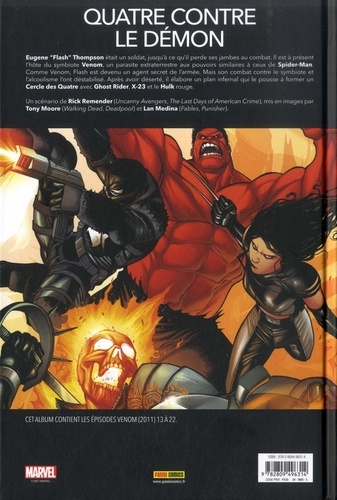 Eugene "Flash" Thompson était un soldat, jusqu'à ce qu'il perde ses jambes au combat. II est à présent l'hôte du symbiote Venom, un parasite extraterrestre aux pouvoirs similaires à ceux de Spider-Man. Comme Venom, Flash est devenu un agent secret de l'armée. Mais son combat contre le symbiote et l'alcoolisme l'ont déstabilisé. Après avoir déserté, il élabore un plan infernal qui le pousse à former un Carde des Quatre avec Ghost Rider, X-23 et le Hulk rouge. Un scenario de Rick Remender (Unc nnyAvengers, The Last Days of American Crime), mis en images par Tony Moore (Walking Dead, Deadpoo0 et Lan Medina (Fables, Punisher).