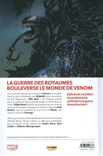 Venom a un fils ! Mais protéger le jeune Dylan devient compliqué lorsque les hordes de Malekith menacent d'envahir la Terre, en pleine Guerre des Royaumes. En plus, le Seigneur des Elfes Noirs a décidé de faire du symbiote son arme ! Et pendant ce temps, Carnage continue de s'en prendre à tous ceux qui ont un jour été liés à un symbiote. Le scénariste Donny Cates reviendra sur la série au cinquième tome, mais en attendant, c'est Cullen Bunn, l'auteur de la Massacrologie Deadpool, qui reprend les rênes le temps de trois épisodes, liés au crossover War of the Realms. Inclus également : le one-shot Bûcher funéraire qui prépare le terrain pour Absolute Carnage !