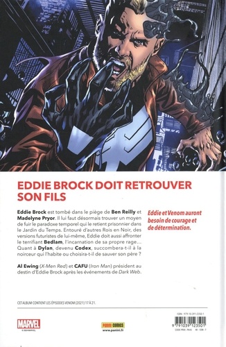 Eddie Brock doit retrouver son fils. Eddie Brook est tombé dans le piège de Ben Reilly et Madelyne Pryor. Il lui faut désormais trouver un moyen de fuir le paradoxe temporel qui le retient prisonnier dans le Jardin du Temps. Entouré d'autres Rois en Noir, des versions futuristes de lui-méme, Eddie doit aussi affronter le terrifiant Bedlam, l'incarnation de sa propre rage... Quant à Dylan, devenu Codex, succombera-t-il à la noirceur qui l'habite ou choisira-t-il de sauver son père ? Eddie et Venom auront Al Ewing (X-Men Red) et CAFU (Iron Man) président au destin d'Eddie Brock après les événements de Dark Web. besoin de courage et de détermination. Cet album contient les épisodes Venom (2021) 17 à 21.
