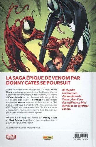 Après les événements d'Absolute Carnage, Eddie Brock se retrouve sur une sinistre île déserte. Mais ce n'est certainement pas pour des vacances, car même si Cletus Kasady est mort, la menace de son symbiote est encore bien vivante. Carnage n'a pas infecté uniquement Venom, mais tous les êtres vivants de l'île ! Eddie se retrouve à présent confronté à un immense défi. Traqué aux quatre coins de l'île, il n'a aucune échappatoire. Pour survivre, il devra faire des choix qui pourraient bien le condamner à jamais. Un binôme d'exception, formé par Donny Cates et Mark Bagley, jette Venom dans un piège dont il pourrait ne plus jamais sortir. Cet album contient les épisodes Venom (2018) 21 à 25.