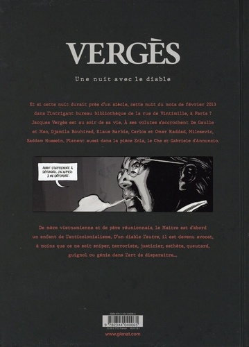 Dans l'intimité du plus controversé des avocats du XXème siècle. On ne présente plus maître Jacques Vergès tant sa réputation sulfureuse le précède. Né dans les années 1920 en Thaïlande, il grandit sur l'île de la Réunion et se passionne très tôt pour la politique. " Narcissique ", " cynique " et " provocateur ", il enchaînera les procès médiatiques jusqu'à devenir une star du barreau dans les années 80. En prenant la défense des plus grands criminels, comme celle du nazi Klaus Barbie ou de Slobodan Milosevic, il forge sa propre légende d'avocat du diable. En 50 ans de carrière, il pénètre les hautes sphères du pouvoir, tisse des amitiés - Pol Pot, Mao, Carlos, Saddam Hussein... - et ne cesse de cultiver le mystère de ses huit années de disparition. On ne partage pas toujours ses idées mais sa trajectoire reste fascinante. Résistant à 17 ans puis fervent militant anticolonialiste, il embrasse une carrière d'avocat presque malgré lui en 1956. Très vite, il fera le choix de défendre les fedayin de la guerre d'Algérie jusqu'à se marier avec l'héroïne de l'indépendance à qui il a sauvé la tête... De l'enfant métis écorché au " salaud lumineux ", cet album revient sur l'essence de ses combats et sa personnalité ambivalente. Après le très remarqué L'Affaire Zola paru en 2019, le journaliste Jean-Charles Chapuzet nous offre un portrait exceptionnel tiré d'un entretien privé avec maître Vergès au soir de sa vie. L'ensemble est illustré de main de maître, avec un noir et blanc aiguisé par Guillaume Martinez, ce dernier faisant son grand retour chez Glénat après plusieurs albums chez Futuropolis, dont sa grande série historique Une vie.