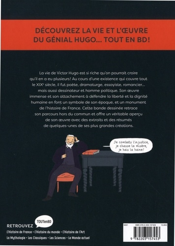 La vie de Victor Hugo est si riche qu'on pourrait croire qu'il en a eu plusieurs ! Au cours d'une existence qui couvre tout le XIXe siècle, il fut poète, dramaturge, essayiste, romancier... mais aussi dessinateur et homme politique. Son oeuvre immense et son attachement à défendre la liberté et la dignité humaine en font un symbole de son époque, et un monument de l'histoire de France. Cette bande dessinée retrace son parcours hors du commun et offre un véritable aperçu de son oeuvre avec des extraits et des résumés de quelques-unes de ses plus grandes créations.