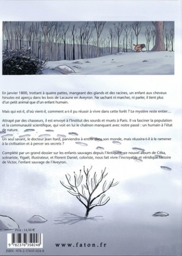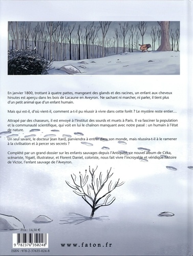 En janvier 1800, un enfant est aperçu dans la forêt, trottant à quatre pattes et mangeant des glands et des racines... Cheveux hirsutes, poussant des grognements, mordant, il ne sait ni marcher, ni parler. En fait, il tient plus d'un petit animal que d'un enfant d'homme. Qui est-il ? D'où vient-il ? Depuis combien de temps vit-il dans la forêt ? Comment a-t-il miraculeusement réussi à y survivre ? C'est un grand mystère... Ramené à Paris, il va fasciner la population et la communauté scientifique, lui l'Homme à l'état de nature, le chaînon manquant avec notre passé. Un seul savant va parvenir à rentrer dans son monde : le docteur Jean Itard. Mais réussira-t-il à le ramener à la civilisation et à percer ses secrets ? Victor, l'enfant sauvage de l'Aveyron, a réellement existé. Découvrez dans cet album sa véritable histoire... Cette BD est complétée par un dossier documentaire pour en savoir plus sur les enfants sauvages et ce qui fait que l'Homme est Homme.