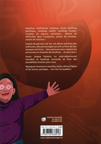 Handicap intellectuel, handicap visuel, handicap psychique, handicap auditif, handicap moteur, troubles du spectre autistique... Autant de difficultés dans l'existence, autant de combats, autant de victoires ! Inspiré de parcours de vie, cet album présente des aventures, des personnages qui ont su faire de leur manque une force... Des aventures pour inspirer les personnes en situation de handicap... et nous tous ! Avant chaque histoire, un mini-rédactionnel introduit le handicap concerné et livre des possibilités d'action pour tous. Rejoignez l'aventure ! Avec Elo, Giulia, Alfred, Pajtim et les autres, partagez... ces vies incroyables !