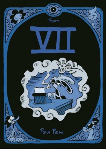 La Mort attend patiemment le prochain tome de sa série préférée. Mais l'auteur Titus Caropin souffre du syndrome de la page blanche et la parution de son septième roman a été remise aux calendes grecques. Lorsque même le karaoké n'arrive plus à raviver la flamme, c'est que l'heure est grave ! Mais la panne d'inspiration de Titus se transforme en angoisse existentielle lorsque la Grande faucheuse vient lui demander une dédicace. Bande dessinée sans texte évoquant à la fois le travail de Fred et de Jim Woodring ainsi que les bons vieux Looney Tunes de Chuck Jones, l'élégant VII nous permet surtout de découvrir un jeune auteur des plus prometteurs. Réflexion à la fois drôle et sincère sur la mort et la création, VII se démarque d'abord par la remarquable fluidité de son découpage. Mais une lecture plus attentive révèle la méticulosité avec laquelle Thom compose ses planches, truffées de détails poétiques et de subtils gags visuels. Si l'impeccable sens du rythme du jeune auteur montréalais rappelle par moments le dessin animé, sa maîtrise des codes du neuvième art nous rappelle que la bande dessinée muette est une façon pour lui d'explorer l'essence de ce médium.