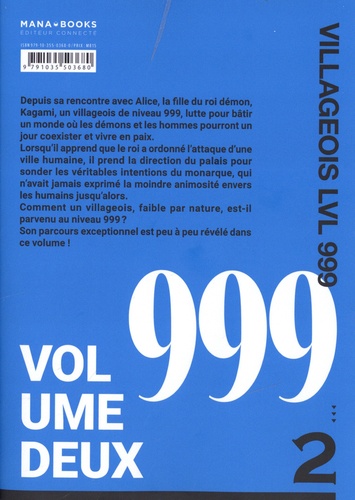 Depuis sa rencontre avec Alice, la fille du roi démon, Kagami, un villageois de niveau 999, lutte pour bâtir un monde où les démons et les hommes pourront un jour coexister et vivre en paix. Lorsqu'il apprend que le roi a ordonné l'attaque d'une ville humaine, il prend la direction du palais pour sonder les véritables intentions du monarque, qui n'avait jamais exprimé la moindre animosité envers les humains jusqu'alors. Comment un villageois, faible par nature, est-il parvenu au niveau 999 ? Son parcours exceptionnel est peu à peu révélé dans ce volume !