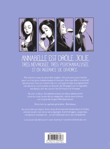 Annabelle est drôle, jolie, névrosée, très psychanalysée, et... en instance de divorce. Parisienne jusqu'au bout des ongles, elle est aussi journaliste pour un très gros hebdomadaire français. Alors qu'elle n'y connait absolument rien en matière de vin, son patron (qui est également son père) lui commande un dossier de 50 pages sur le vignoble bordelais. Ni une, ni deux, Annabelle fourgue ses deux ados à son ex-mari avant de se catapulter, valise sous le bras, sur le quai de la gare Montparnasse. Direction la capitale girondine : Bordeaux ! Au cours de son séjour (trois mois d'immersion totale dans le milieu viticole locale), rien ne lui sera épargné...Isabelle Bunisset écrit un ouvrage piquant à souhait sur l'univers très élitiste du vin, illustré par le trait expressif de Giuseppe Liotti. Un moyen de découvrir avec humour et dérision le microcosme de « la noblesse du bouchon », ainsi que l'a qualifié François Mauriac.