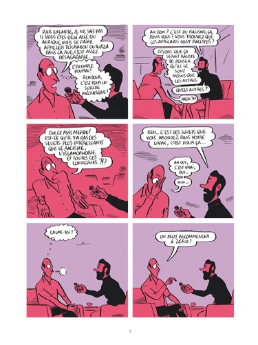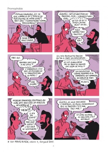 "On me traite de réac mais je ne le suis pas. Je suis lucide, c'est tout. Est-ce être réactionnaire de voir à quel point le monde court à sa perte ? N'est-ce pas normal d'être atterré par la bêtise crasse de notre époque ? Une époque où les enfants commandent, où l'idiotie est cool, où le savoir est moqué, où on se demande si c'est pas machiste de tenir la porte aux dames ? Bon, je sais, parfois je m'énerve un peu trop, mais c'est plus fort que moi. Attaqué par la connerie, je réagis, c'est tout. Bon oh, je suis réac." Morgan Navarro
