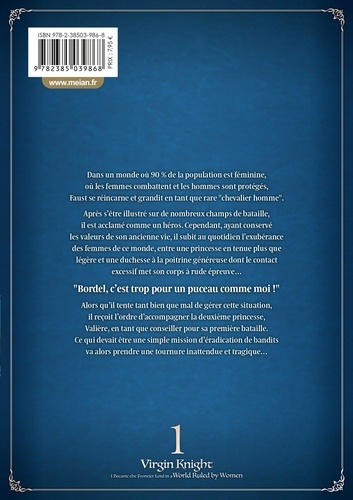 Dans un monde où 90 % de la population est féminine, où les femmes combattent et les hommes sont protégés, Faust se réincarne et grandit en tant que rare "chevalier homme". Après s'être illustré sur de nombreux champs de bataille, il est acclamé comme un héros. Cependant, ayant conservé les valeurs de son ancienne vie, il subit au quotidien l'exubérance des femmes de ce monde, entre une princesse en tenue plus que légère et une duchesse à la poitrine généreuse dont le contact excessif met son corps à rude épreuve... "Bordel, c'est trop pour un puceau comme moi ! " Alors qu'il tente tant bien que mal de gérer cette situation, il reçoit l'ordre d'accompagner la deuxième princesse, Valière, en tant que conseiller pour sa première bataille. Ce qui devait être une simple mission d'éradication de bandits va alors prendre une tournure inattendue et tragique...