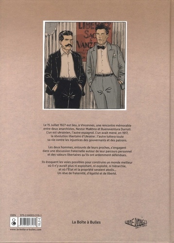 Le 15 Juillet 1927 eut lieu, à Vincennes, une rencontre mémorable entre deux anarchistes, Nestor Makhno et Buenaventura Durruti. L'un est ukrainien, l'autre espagnol. L'un avait mené, en 1917, la révolution libertaire d'Ukraine ; l'autre luttera toute sa vie contre les injustices des gouvernants et des patrons. Les deux hommes, entourés de leurs proches, s'engagent dans une discussion fraternelle autour de leur parcours personnel et des valeurs libertaires qu'ils ont ardemment défendues. Ils évoquent les voies possibles pour construire un monde meilleur où il n'y aurait plus ni exploitant, ni exploité, ni hiérarchie, et où l'Etat et la propriété seraient abolis... Un rive de fraternité, d'égalité et de liberté.