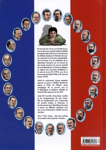Du haut de mes 14 ans, moi le Petit Jolo, je vous invite tout au long de cette formidable bande dessinée à découvrir comme jamais les dédales élyséens et l'itinéraire de ceux qui aspiraient à la fonction présidentielle. Vous trouverez tous les présidents de la République française qui ont exercé les plus hautes fonctions du pouvoir exécutif de notre République. Un terme qui désigne un régime sons souverain héréditaire, à la suite de Louis XVI (1792), puis de la Monarchie de Juillet (1848), et du Second Empire (1870). Adulé ou controversé, chaque président apporte sa pierre à l'édifice républicain depuis le Palais de l'Elysée, centre névralgique de ce pouvoir sous la Ve République et résidence officielle du Chef de l'étal depuis la loi de 1879. Celte BD fourmille d'anecdotes insolites et de renseignements les plus divers. Elle est indispensable pour comprendre de manière ludique et historique, le fonctionnement de la République française à travers ses différents présidents ainsi que sur les événements notables de leurs mandats. Alors ? Vite ! Entrez... dans les coulisses de la petite et de la grande "Histoire".