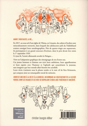 Effrontée, déterminée, passionnée, inventive et transgressive : telle est la jeunesse intemporelle qui se dessine en Europe de l'Est d'avant-guerre, juste avant d'être tragiquement brisée par la Shoah. Vivre nous révèle les confidences de six adolescents, qui ont écrit leurs autobiographies pour un concours d'écriture en yiddish organisé dans les années trente. Perdues dans le tumulte de l'Histoire et récemment retrouvées dans le sous[1]sol d'une église à Vilnius, ces archives ont ému l'auteur Ken Krimstein, qui en a réalisé une adaptation graphique. Ces témoignages du passé s'animent sous la plume tendre et le trait vif de l'auteur, qui compose ainsi un remarquable travail de mémoire et un hommage vibrant à la jeunesse du Yiddishland. Ces récits drôles, poignants et spontanés recomposent la richesse et la diversité d'un monde anéanti par la barbarie nazie.