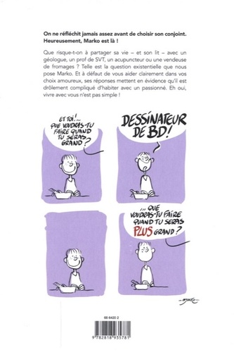 Que risque-t-on à partager sa vie – et son lit – avec un géologue, un prof de SVT, un acupuncteur ou une vendeuse de fromages ? Telle est la question existentielle que nous pose Marko. Et à défaut de vous aider clairement dans vos choix amoureux, ses réponses mettent en évidence qu'il est drôlement compliqué d'habiter avec un passionné. Eh oui, vivre avec vous n'est pas simple !