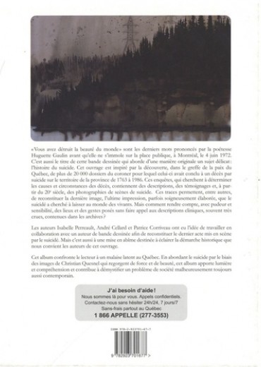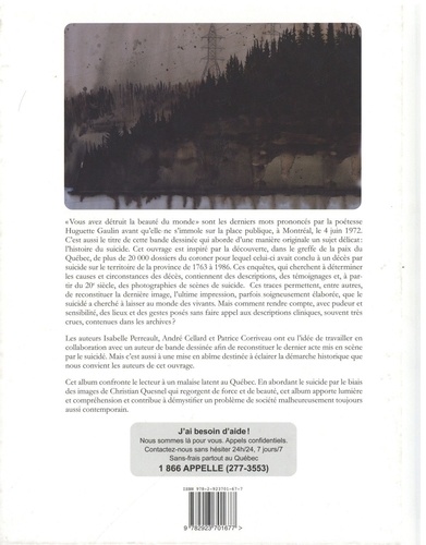 " Vous avez détruit la beauté du monde " sont les derniers mots prononcés par la poétesse Huguette Gaulin avant qu'elle ne s'immole sur la place publique, à Montréal, le 4 juin 1972. C'est aussi le titre de cette bande dessinée qui aborde d'une manière originale un sujet délicat : l'histoire du suicide. Cet ouvrage est inspiré par la découverte, dans le greffe de la paix du Québec, de plus de 20 000 dossiers du coroner pour lesquels celui-ci avait conclu à un décès par suicide sur le territoire de la province, entre 1763 et 1986. Ces enquêtes, destinées à déterminer les causes et circonstances des décès, contiennent des descriptions, des témoignages et, à partir du XX? siècle, des photographies de scènes de suicide. Ces traces permettent, entre autres, de reconstituer la dernière image, l'ultime impression, parfois soigneusement élaborée, que la personne suicidée a cherché à laisser au monde des vivants. Mais comment rendre compte, avec pudeur et sensibilité, des lieux et des gestes posés sans faire appel aux descriptions cliniques, souvent très crues, contenues dans les archives ? Les auteurs Isabelle Perreault, André Cellard et Patrice Corriveau ont eu l'idée de travailler en collaboration avec un auteur de bande dessinée afin de reconstituer le dernier acte mis en scène par la personne suicidée. Mais c'est aussi à une mise en abyme destinée à éclairer la démarche historique que nous convient les auteurs de cet ouvrage.