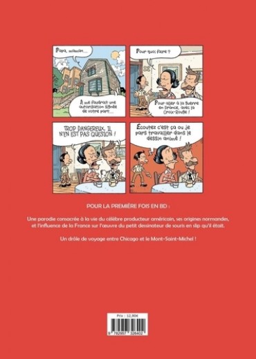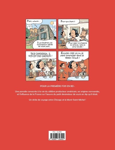 Pour la première fois en BD : une parodie consacrée à la jeunesse de Walt Disney (renommé Walter Iziny), ses origines normandes, et l'influence de la France sur l'oeuvre du petit dessinateur de souris en slip qu'il était. Un drôle de voyage qui vous emmènera de Chicago au Mont-Saint-Michel... en passant par Isigny ! La BD comprend deux gags par page, soit un total de 88 histoires colorisées avec talent par Dominique Thomas (Le retour à la terre, Spirou, Donjon Monsters...).