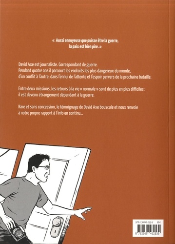 Un témoignage sans concession (et un certain goût pour la provocation) : la guerre, entre terreur et ennui David Axe est journaliste. Correspondant de guerre. Pendant quatre ans il parcourt les endroits les plus dangereux du monde, d'un conflit à l'autre, dans l'ennui de l'attente et l'espoir pervers de la prochaine bataille. Entre deux missions, les retours à la vie "normale" sont de plus en plus difficiles : il est devenu étrangement dépendant à la guerre. Rare et sans concession, le témoignage de David Axe bouscule et nous renvoie à notre propre rapport à l'info en continu...