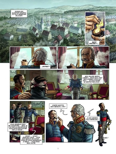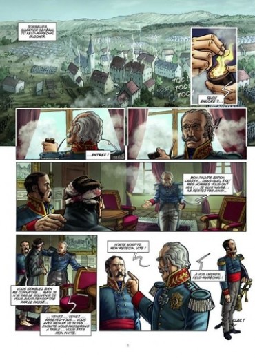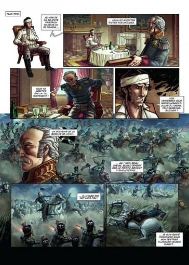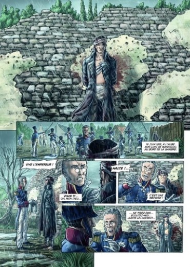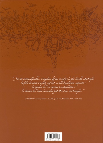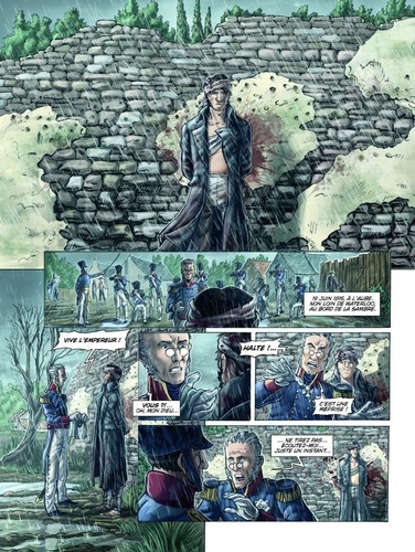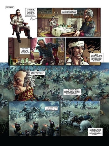 19 juin 1815, à l'aube. Non loin de Waterloo, au bord de la Sambre. Un homme est sur le point d'être fusillé par l'armée prussienne. Celui qui doit lui bander les yeux avant l'ultime sentence reconnait alors le baron Larrey, chirurgien en chef de la garde de Napoléon Bonaparte en personne ! Gracié in extremis, Larrey est invité à déjeuner avec le général en chef des armées prussiennes : le feld-maréchal Blücher. Ensemble, ils reviennent sur la bataille de Waterloo qui vit la défaite des armées françaises, non sans panache...Alors que cette année commémore le bicentenaire de Waterloo, vivez cette tragique bataille dans un one-shot passionnant à la narration parfaitement maîtrisée, aussi vivant que précis d'un point de vue militaire et historique. Un contexte complété par le dossier de 15 pages en fin d'album rédigé par Jean Tulard (l'historien de référence sur la période napoléonienne), revenant en détail sur le déroulement de la bataille.