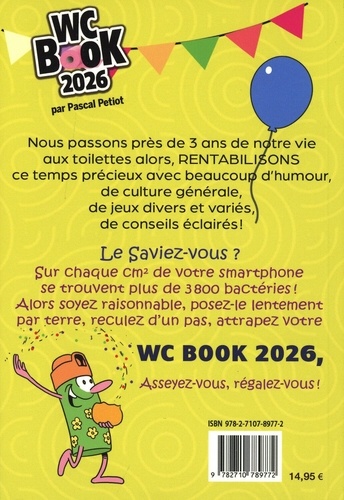 Nous passons près de 3 ans de notre vie aux toilettes alors, rentabilisons ce temps précieux avec beaucoup d'humour, de culture générale, de jeux divers et variés, de conseils éclairés ! Le Saviez-vous ? Sur chaque cm2 de votre smartphone se trouvent plus de 3800 bactéries ! Alors soyez raisonnable, posez-le lentement par terre, reculez d'un pas, attrapez votre WC BOOK 2026, Asseyez-vous, régalez-vous !