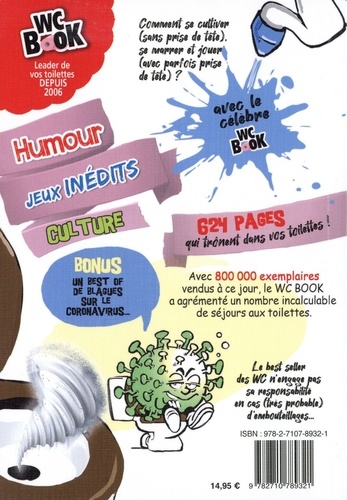 Le WC BOOK, c'est 624 pages qui vous accompagnent chaque année aux toilettes depuis 15 ans ! Avec 800 000 exemplaires vendus depuis 2006, comment chiffrer le nombre d'heures passées à dévorer ses contenus éclectiques ? Blagues, contrepètries, mots croisés, énigmes, anecdotes historiques, scientifiques & culturelles, histoires insolites, quiz, mots mêlés, sudoku, peopleries, charades, des pages dédiées aux "perles du confinement"... Sans oublier les dessins humoristiques décalés de l'illustrateur belge Ah ! . Vous avez une bonne excuse pour créer un embouteillage devant les toilettes !