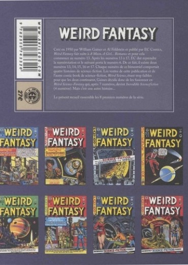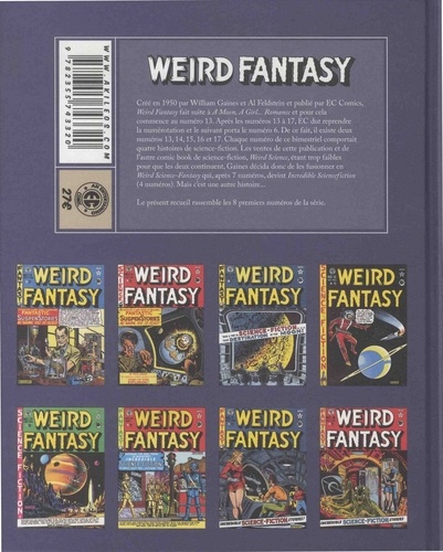 Créé en 1950 par William Gaines et Al Feldstein et publié par EC Comics, Weird Fantasy fait suite à AMoon, A Girl... Romance et pour cela commence au numéro 13. Après les numéros 13 à 17, EC dut reprendre la numérotation et le suivant porta le numéro 6. De ce fait, il existe deux numéros 13,14,15,16 et 17. Chaque numéro de ce bimestriel comportait quatre histoires de science-fiction. Les ventes de cette publication et de l'autre comic book de science-fiction, Weird Science, étant trop faibles pour que les deux continuent, Gaines décida donc de les fusionner en Weird Science-Fantasy qui, après 7 numéros, devint Incredible Sciencefiction (4 numéros). Mais c'est une autre histoire... Le présent recueil rassemble les 8 premiers numéros de la série.