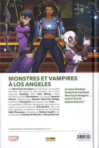 Kelly Thompson (Jessica Jones) et Stefano Caselli (Secret Warriors) proposent une nouvelle version des West Coast Avengers en rapprochant des personnages connus tels Hawkeye, et des héros récents très appréciés des fans comme Gwenpool. Pour protéger Los Angeles, Kate Bishop et Clint Barton réunissent une équipe hétéroclite. Gwenpool, America et Quentin Quire appartiennent désormais aux West Coast Avengers. Ils vont très vite devoir oeuvrer ensemble lorsqu'une ancienne coéquipière dévaste la région.