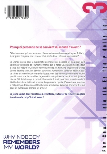 Pourquoi personne ne se souvient du monde d'avant ? Montrons-leur qui nous sommes. L'heure est venue de contre-attaquer. Soldats, il est grand temps de nous relever et de sortir de ces obscurs souterrains ! La Grande Guerre pour la suprématie du monde qui a opposé les cinq races s'est soldée par la victoire de l'humanité menée par le héros Sid. Mais le monde a tout à coup été réécrit et, dans ce nouveau monde, les humains ont perdu la Grande Guerre des cinq races. Les derniers survivants humains ont construit des cités souterraines en attendant de mener la riposte, mais des démons patrouilleurs ont fini par découvrir une de ces villes. Le jeune Kai sait qu'il est le seul à pouvoir jouer le rôle de Sid, le héros qui a conduit l'humanité à la victoire dans le vrai monde. Il décide donc de se battre et propose d'organiser la riposte. L'assaut sera lancé sur le nid principal des démons et leur héroïne sera la cible à abattre. L'heure est venue pour les humains de prendre les armes ! Un jeune homme dont l'existence a été effacée va tenter de remettre en place le vrai monde tel qu'il était avant !