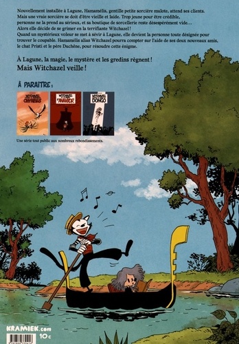 Nouvellement installée à Lagune, Hamamélis, gentille petite sorcière mulote, attend ses clients. Mais une vraie sorcière se doit d'être vieille et laide. Trop jeune pour être crédible, personne ne la prend au sérieux, et sa boutique de sorcellerie reste désespérément vide... Alors elle décide de se grimer en la terrifiante Witchazel ! Quand un mystérieux voleur se met à sévir à Lagune, elle devient la personne toute désignée pour trouver le coupable. Hamamélis alias Witchazel pourra compter sur l'aide de ses deux nouveaux amis, le chat Pristi et le père Duchêne, pour résoudre cette énigme. A Lagune, la magie, le mystère et les gredins règnent ! Mais Witchazel veille !