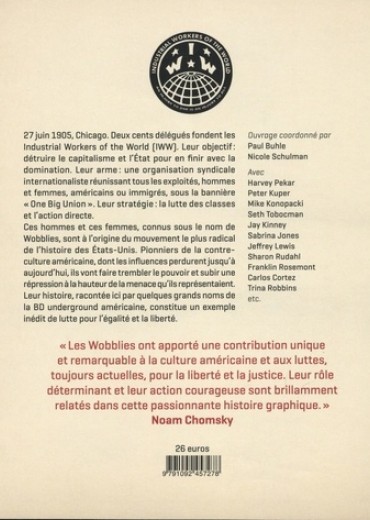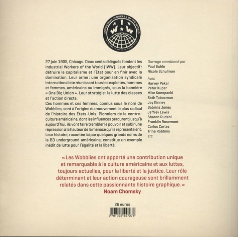 27 juin 1905, Chicago. Deux cents délégués fondent les Industrial Workers of the World (IWW). Leur objectif : détruire le capitalisme et l'Etat pour en finir avec la domination. Leur arme : une organisation syndicale internationaliste réunissant tous les exploités, hommes et femmes, américains ou immigrés, sous la bannière "One Big Union" . Leur stratégie : la lutte des classes et l'action directe. Ces hommes et ces femmes, connus sous le nom de Wobblies, sont à l'origine du mouvement le plus radical de l'histoire des Etats-Unis. Pionniers de la contreculture américaine, dont les infl uences perdurent jusqu'à aujourd'hui, ils vont faire trembler le pouvoir et subir une répression à la hauteur de la menace qu'ils représentaient. Leur histoire, racontée ici par quelques grands noms de la BD underground américaine, constitue un exemple inédit de lutte pour l'égalité et la liberté. Avec Harvey Pekar, Peter Kuper, Mike Konopacki, Trina Robbins, Seth Tobocman, Jay Kinney, Sabrina Jones...