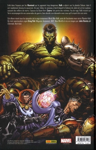 Réédition en MARVEL DELUXE de World War Hulk, une saga culte de Greg Pak (Planète Hulk) et John Romita Jr (Avengers vs X-Men). Exilé dans l'espace pour avoir causé d'importants dégâts sur la Terre, Hulk devient le souverain de la planète Sakaar aux côtés de la reine Caiera. Hélas ! Alors que Hulk semble enfin apaisé, l'explosion du vaisseau à bord duquel il était arrivé, fait des millions de victimes, dont Caiera, enceinte de leur enfant. Que les héros de la Terre se tiennent prêts car le Colosse de Jade revient avec la ferme intention de se venger !
