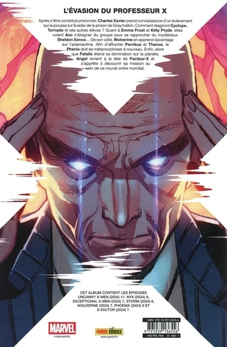 Après s'être constitué prisonnier, Charles Xavier prend connaissance d'un événement qui le pousse à s'évader de la prison de Graymalkin. Comment réagiront Cyclope, Tornade et ses autres élèves ? Quant à Emma Frost et Kitty Pryde, elles voient Axo s'éloigner du groupe pour se rapprocher du mystérieux Sheldon Xenos... De son côté, Wolverine en apprend davantage sur l'adamantine. Afin d'affronter Perrikus et Thanos, le Phénix doit se métamorphoser à nouveau. Enfin, alors que Fatalis étend sa domination sur la planète, Angel revient à la tête de Facteur-X et s'apprête à découvrir au sein de ce nouvel ordre mondial.