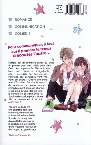 Pour communiquer, faut aussi prendre le temps d'écouter l'autre... Parfois, qui dit première année au lycée dit premier petit ami... Mais pour Nana Onô, c'est impensable. Elle se trouve bien trop niaise et insignifiante pour intéresser qui que ce soit. Pourtant, ses certitudes vont vite voler en éclats ! Quand elle tient tête à Tomoharu Sudaka, le voyou de sa classe, ce dernier tombe immédiatement sous son charme et n'a plus qu'une idée en tête : la convaincre de sortir avec lui. Serait-ce l'occasion pour la jeune fille de commencer à se voir autrement ? You Are So Cute est une adorable comédie romantique mettant en scène un duo improbable ! Sous la plume enjouée d'Akari Hatta, découvrez le quotidien mouvementé d'une lycéenne ingénue et d'un voyou au grand coeur ! Série en 7 tomes.