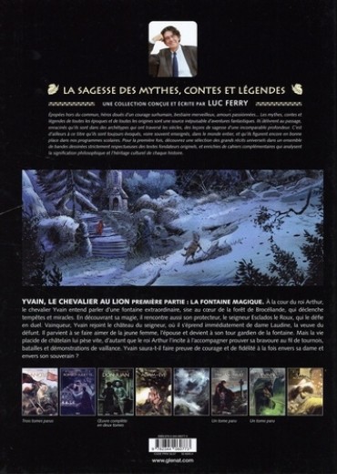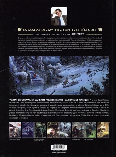 YVAINC LE CHEVALIER AU LION PREMIERE PARTIE : LA FONTAINE MAGIQUE. A la cour du roi Arthur, le chevalier Yvain entend parler d'une fontaine extraordinaire, sise au coeur de la forêt de Brocéliande, qui déclenche tempêtes et miracles. En découvrant sa magie, il rencontre aussi son protecteur, le seigneur Esclados le Roux, qui le défie en duel. Vainqueur, Yvain rejoint le château du seigneur, où il s'éprend immédiatement de dame Laudine, la veuve du défunt Il parvient à se faire aimer de la jeune femme, l'épouse et devient à son tour gardien de la fontaine. Mais la vie placide de châtelain lui pèse vite, d'autant que le roi Arthur l'incite à l'accompagner prouver sa bravoure au fil de tournois, batailles et démonstrations de vaillance. Yvain saura-t-il faire preuve de courage et de fidélité à la fois envers sa dame et envers son souverain ?