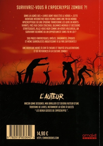 Survivrez-vous à l'apocalypse zombie ? ! Dans la lignée des "livres dont vous êtes le héros", cette aventure interactive vous plonge dans une fin du monde apocalyptique ou une épidémie transforme les gens en morts-vivants. Face aux choix cruciaux, dilemmes moraux et décisions stratégiques, allez-vous agir comme un héros valeureux, un survivant acharne ou un opportuniste sans foi ni loi ? 300 pages fantastiques, drôles, saignantes, épiques et même surréalistes aboutissant à 50 fins différentes ! Une aventure menée à cent à l'heure et truffée d'illustrations et de références à la culture zombie !