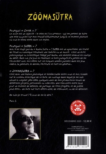"Pourquoi "Zoom" ? Le zoom est un objectif - le mien en l'occurrence - qui me permet de faire une mise an point sur mon travail d'illustrateur jusqu'à ce moment plaisant où vous le tenez enfin dans vos mains. Pourquoi "Sutra" ? Non, il ne s'agit pas du du "Kama Sutra" ! Sutra est un aphorisme. Un traité de rituel ou canonique résumant une théorie ou un savoir. C'est un écrit philosophique ou scientifique rédigé par Kama, une divinité hindoue en charge du désir. Mais oui, j'ai joui en réalisant ce livre puisqu'il m'a permis de me réconcilier avec moi-même sur ces longues années passées dans les jeux vidéos, la peinture, le dessin, l'écriture et l'art en général... "Zoomasutra" ? C'est donc une liaison platonique et intellectuelle entre vous et moi, fondée sur le contenu éclectique de ce livre. Un ouvrage dans lequel je me suis amusé à compiler pêle-mêle, quelques-unes de mes productions issues de différents projets, personnels ou collectifs. Une rencontre entre nous pour un moment de détente, de partage, de rires j'espère, et de poésie peut-être... Un livre sur l'art d'être aimé, de s'émouvoir, ou de se détester. Me suis-je trouvé ? A vous de me le dire ! " Paco S.